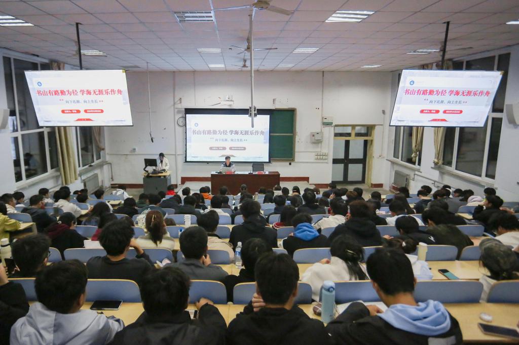 在1A107举办新老生经验交流会,学院2021级优秀学生代表张艳睿、李欢担任主讲人,2024级全体新生参加。