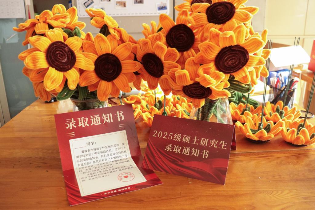 精心组织,用心策划,为2025届毕业生设计了包含“九个一”在内的考研大礼包,即装满一个福袋、送上一份祝福、制作一张贺卡、领取一块祝福牌、留下一张合影、抽取一次盲盒、送上一杯热茶、摆放一对展板,挂上一对高“粽”。
