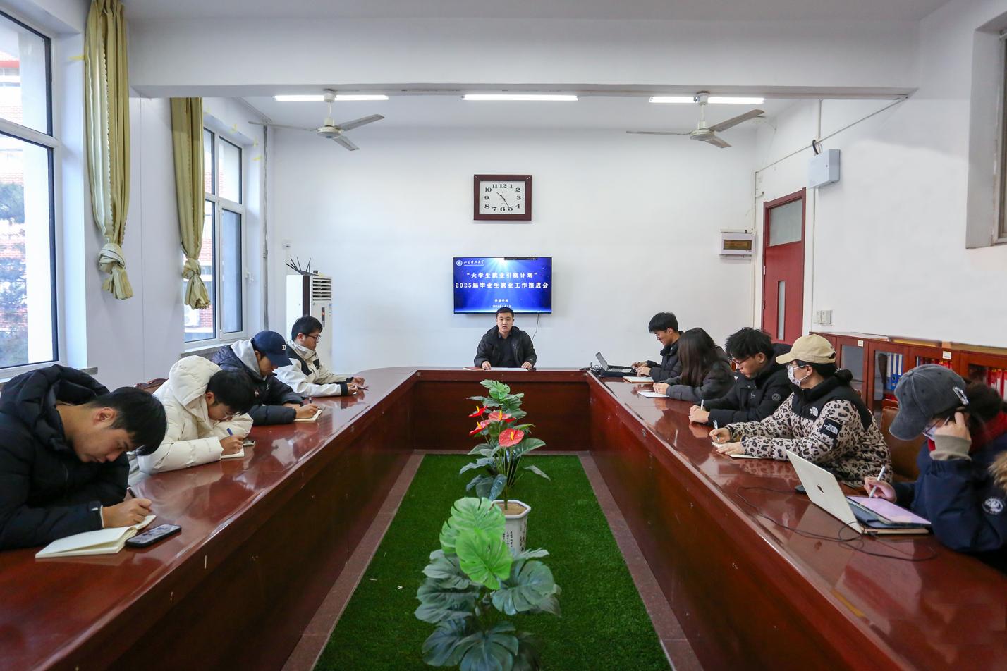 在1A214召开“大学生就业引航计划”2025届毕业生就业工作推进会,2025届毕业生辅导员李炳树主持会议,2025届主要学生干部参会。