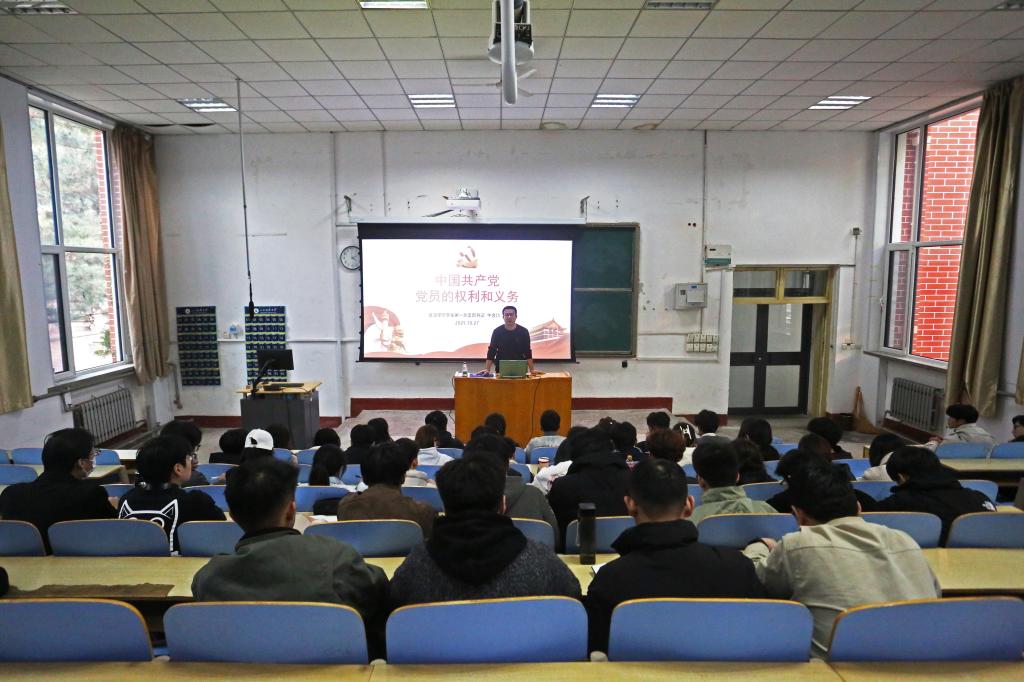 学生第一党支部书记、辅导员牛会功在1A107教室为学院第43期入党积极分子讲授“中国共产党党员的权利和义务”专题党课。
