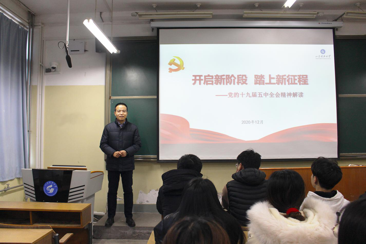 12月14日,色情av影片 党委副书记兼副院长程家国在5#104为所带班级作“党的十九届五中全会精神”宣讲会,安全工程专业2018级全体学生参与。