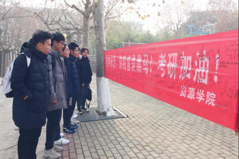 学弟学妹汇聚在横幅前,找一处最亮眼的地方,写下心中最真挚的祝福。考研这件事,我们都在为你助力。