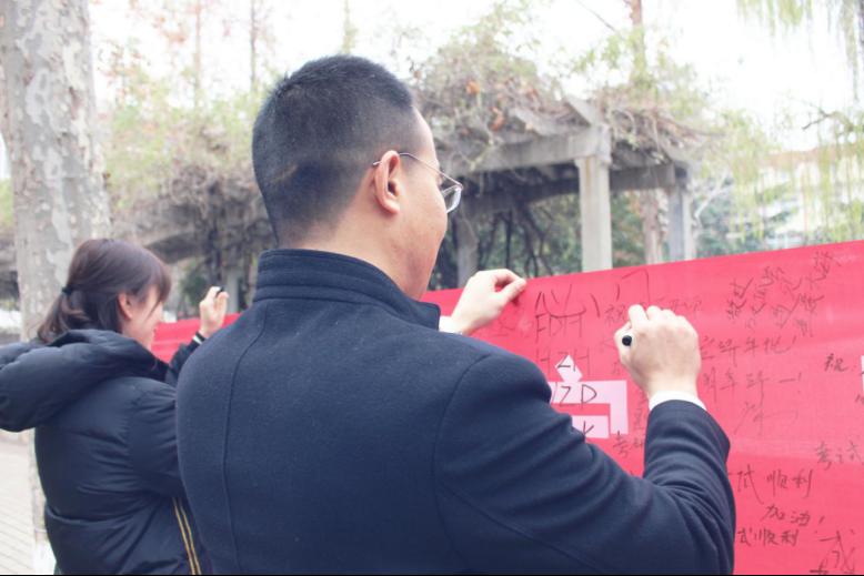 学院领导、辅导员纷纷到场,为考研学子送去祝福,“考研上岸”、“精益求精”、“成绩理想”……字字句句充满了老师们对考研同学的美好祝愿。