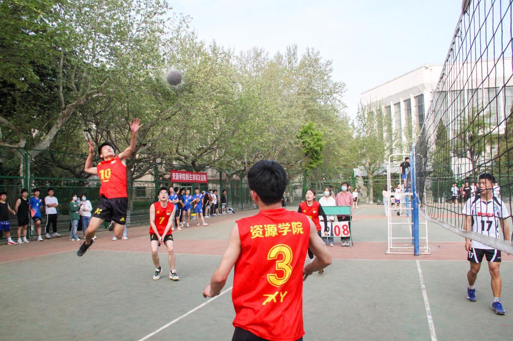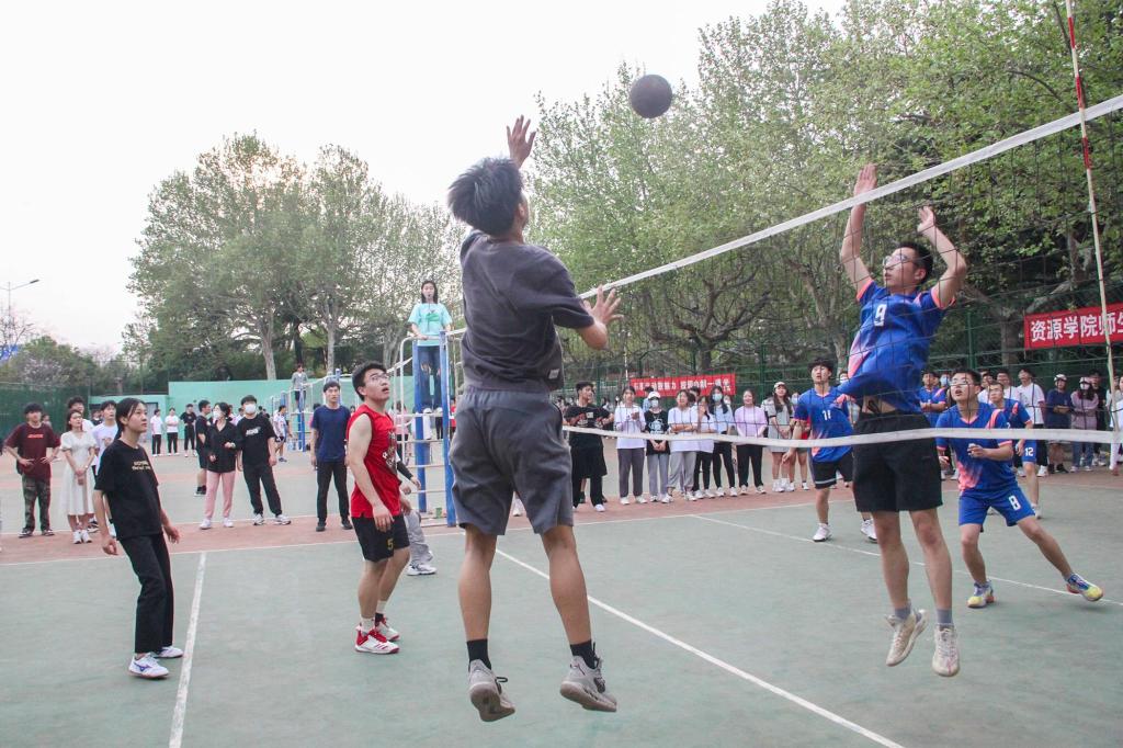 在首日比赛中,洒艳队与张运忠队的对决尤为激烈。比赛开始后,洒艳队迅速进入比赛状态,多次拦住三号位半高球、短平快球;张运忠队选手们不甘落后,凭借精彩的救球与犀利的扣球紧咬比分,将比赛推入白热化阶段。最终,洒艳队越战越勇,灵活运用吊球技术连续得分,赢得比赛胜利。其他场地上,参赛师生紧密配合,长传、扣杀、垫球……队伍之间你追我赶,精彩场面频频出现,场下喝彩助威声不绝于耳。经过激烈的角逐,洒艳、张裴、牛会功老师队赢得首日比赛胜利。