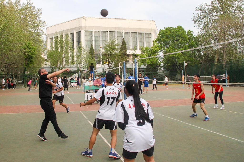 师生排球友谊赛在东校园排球场拉开帷幕。比赛采用“五局三胜”积分循环赛制,以辅导员为单位,共有七支队伍参赛。