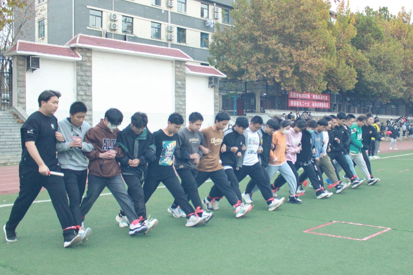 第一阶段比赛分为“十人九足”“牵手呼啦圈”和“飞盘接力”三个环节,按照累计时长进行成绩排名。在“十人九足”环节中,20名同学排成一横排,相邻两人用绳将腿绑在一起,共同前进,同学们携手并肩,步伐整齐,在响亮的“一二一二”口号中携手同行、稳健前进;在“牵手呼啦圈”环节中,15名同学手拉手呈一字排开,每位同学依次通过呼啦圈,同学们密切协作、团结配合、奋力传递,轻松完成挑战;在“飞盘接力”环节中,10名同学分别间隔五米,沿指定路线传递飞盘,大家全神贯注,飞盘在空中划出一道完美的弧线,最后一名同学手拿飞盘快速冲到终点线。