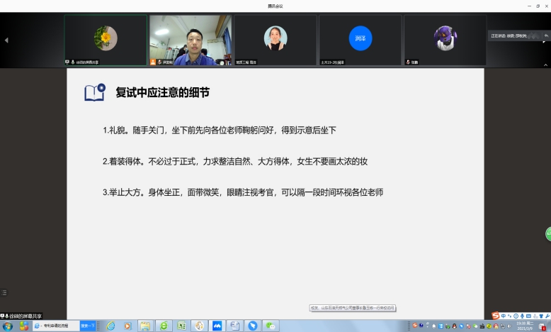 会议邀请2020届优秀毕业生现分别就读于北京科技大学的徐硕、中国矿业大学的张鹏、贵州大学的车方涛为2021届毕业生作考研复试经验分享交流。三位同学首先向大家讲解了复试流程、注意事项以及准备过程应注意的问题。他们指出,土木工程专业备考时,应针对所考取的院校专业英语考试范围,提前展开学习;在复试过程中,要注重细节,回答问题思维要缜密,表达要流畅,注重逻辑性,面对不会的问题,应实事求是,始终保持对学术的严谨性和严肃性。互动环节,同学们围绕复试流程、调剂信息、应试技巧等方面存在的疑惑积极提问,三位毕业生耐心倾听、悉心回答。