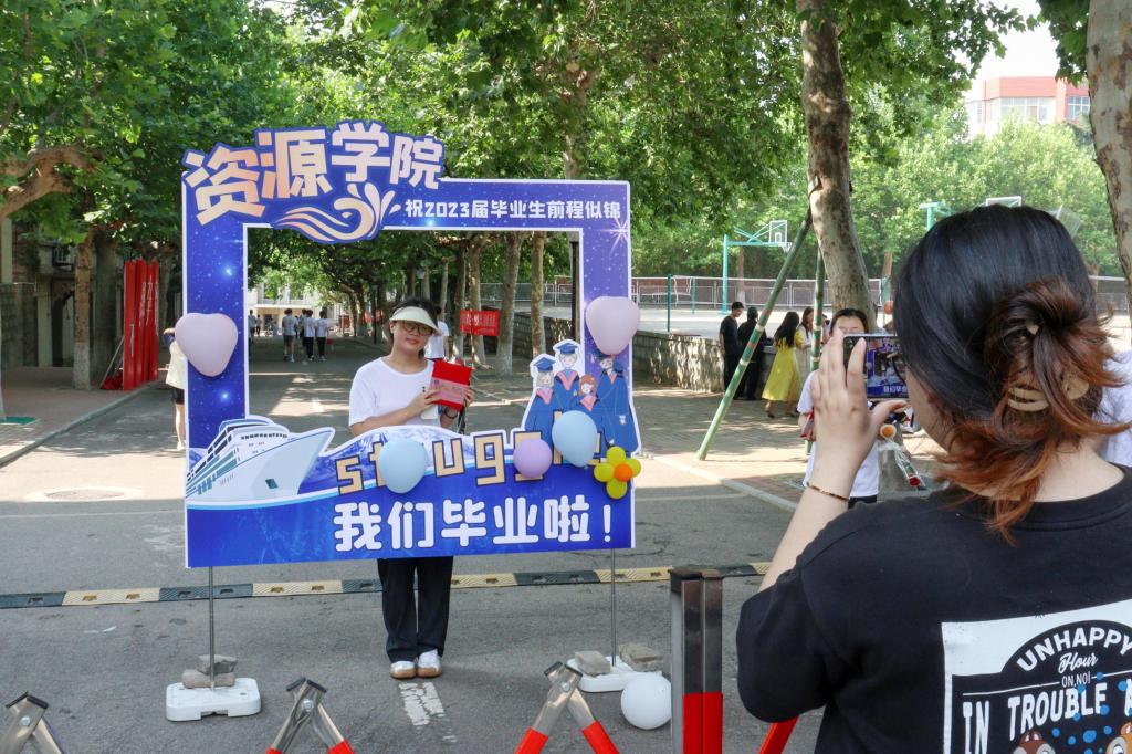 匆匆那年,定格瞬间。毕业生们三三两两齐聚在合照留念展板前,用照片定格下同窗之谊、师生之情,留存住那段纯真美好的记忆。