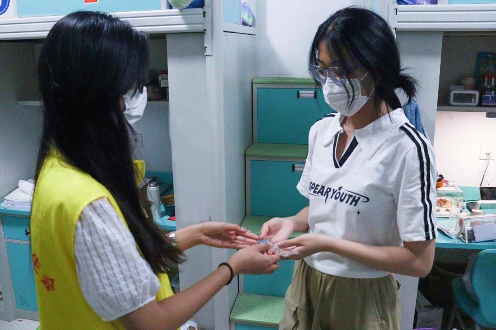 “学姐,毕业快乐,这是您的毕业纪念品。”学生会成员走进毕业生宿舍,送上精美的钥匙扣和温暖的祝福。