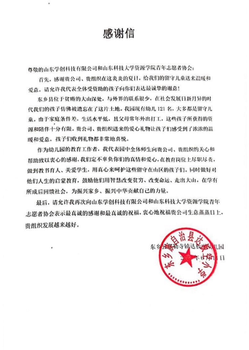 收到了来自东乡县那勒寺镇达板空幼儿园的感谢信。