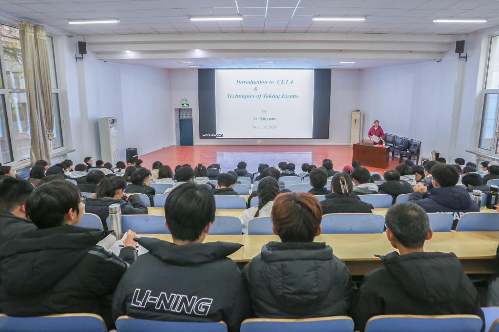 在1B117举办英语四级考试辅导讲座,公共课教学部硕士生导师李新元老师主讲,学院2023、2024级学生踊跃参加。