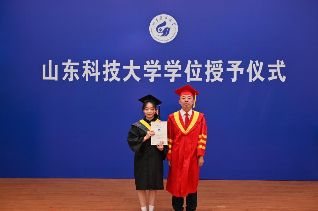 党委副书记程家国在仪式上致辞。他向顺利完成学业的226名本科生毕业生、71名硕士毕业生表示热烈祝贺,对毕业生们取得的优异成绩表示肯定,并表达了对毕业生的惜别和祝福之情。他指出,2025届毕业生在校期间始终以“惟真求新”校训为航标,践行“团结、勤奋、求是、创新”的校风,将“坚韧不拔、发奋图强”的科大精神融入血脉。在学术的殿堂里,大家埋头苦读,以智慧攻克知识难关;在科研的赛道上,大家大胆创新,在各类科创竞赛中屡获佳绩;在社会实践的舞台上,大家躬身力行,用脚步丈量祖国大地。希望大家在今后的人生道路上志存高远,锚定时代坐标;终身学习,永葆进取之心;修身立德,锤炼坚韧品格。仪式上,贾宏俊逐一为获得学位的毕业生正冠拨穗并授予学位证书,与每一位毕业生亲切握手并合影留念。在颁发证书的过程中,贾宏俊也向毕业生们送上了真挚的祝福,希望2025届毕业生能够勇往无前,不惧挑战,用智慧和勇气书写精彩人生,以责任与担当谱写崭新篇章!(文:戴晨晨 图:李已夏)